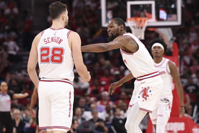 来看一组数据对比,季后赛当申京+小贾+阿门同时在场时,火箭百回合能赢对手6.8分;加上杜兰特,百回合输对手3.8分。如果把杜兰特换成谢泼德,火箭百回合能赢对手13.2分,且对比平均水准,火箭百回合能多投进4.5记三分!如果再加上伊森,火箭最强首发五虎,百回合赢对手14.8分,较平均水准,百回合多进5.6记三分,百回合抢断较平均水准多6.1次,助攻多5.1次!其实不难得出一个结论,当杜兰特在场时,火箭什么都缺!缺高质量的挡拆人,因为申京总是喜欢给杜兰特假挡拆,带防守人夹击杜兰特。