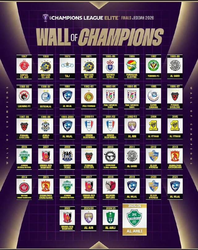 亚冠官方发布了一张亚冠历史冠军墙照片,完整展示了1957年到现在,亚洲俱乐部顶级赛事的所有44个冠军球队,中国3支球队在列,3个细节非常值得探讨一下。