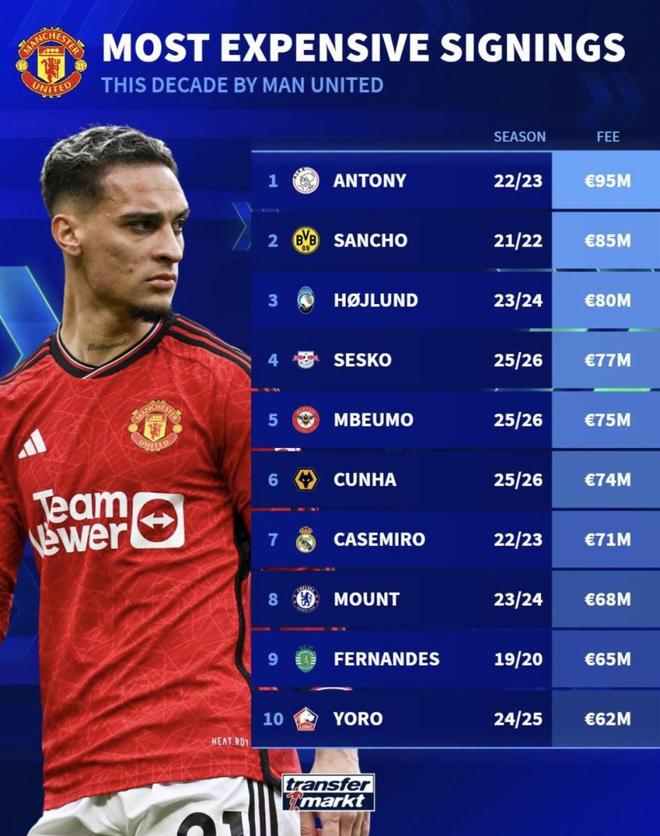 最近这份“曼联近十年最贵引援榜”出炉,最扎眼的其实不是安东尼的9500万欧元排第一,也不是桑乔的8500万欧元排第二,而是前三名里,已经有两笔基本可以定性为严重亏本。目前,曼联已经同意安东尼正式转会贝蒂斯,桑乔被租借到了维拉,加上霍伊伦也被租去那不勒斯。也就是说,榜单前三的高价前场引援,到了2026年这个节点,居然全都没能留在曼联的主线计划里。单看这批人的现状,就是最直接的性价比体现。